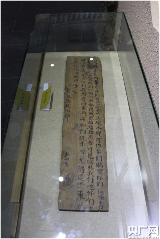在這個碑園的紀念館中,記者發(fā)現(xiàn)了這樣一塊木板。這是一份借據(jù),是當年長征中,紅軍對藏族百姓們的承諾——絕不白拿他們的一顆糧。
