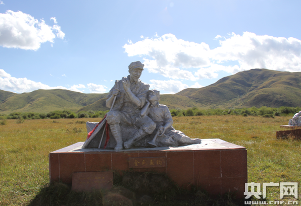 213國道旁,有一座主體為灰色的塑像。一位小紅軍靠在一位老紅軍的身旁。老紅軍的手里拿著根魚竿,小紅軍托著腮看著他。底座有四個金色的大字“金色魚鉤”。