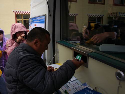 流動(dòng)金融服務(wù)車前,班前村牧民格拉將紅色的存折遞給了坐在車?yán)锏臉I(yè)務(wù)員!耙郧拔覀兇驽X取錢,要跑到50多公里外的縣上辦,特別麻煩,F(xiàn)在好了,服務(wù)車每周都能來,家門口就能辦很方便呢!备窭f。