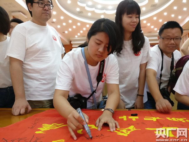 記者在“走轉(zhuǎn)改”湖南站旗幟上簽下自己的名字