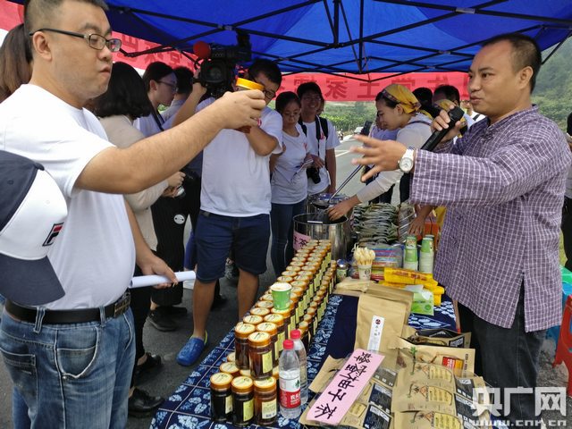 31日的湘西煙雨蒙蒙,循著當(dāng)年紅二、紅六軍團(tuán)長征出發(fā)的足跡,采訪團(tuán)來到鳳凰縣廖家橋鎮(zhèn)菖蒲塘村,記者感受到村民們生活的“甜蜜”。作為一個(gè)80后小伙,以前的周祖耀也像很多村里的年輕人一樣選擇外出打工賺錢。2009年,為了不讓自己的孩子成為留守兒童,周祖耀決定放棄打工生活,開始返鄉(xiāng)創(chuàng)業(yè)。2011年,在各級黨政機(jī)關(guān)的幫助下,他投身水果加工,依托村里足量的柚子資源,研發(fā)出一款蜂蜜柚子茶,取得不錯(cuò)銷路后,周祖耀成立了自己的小企業(yè)周生堂綠色食品廠。