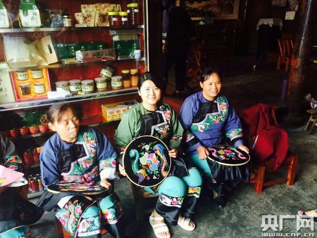 從菖蒲塘村驅(qū)車2個(gè)多小時(shí),采訪團(tuán)到達(dá)花垣縣排碧鄉(xiāng)十八洞村!耙郧斑@里很窮的,我有三個(gè)女兒,全家就靠老公一人在外打工賺錢,小孩差點(diǎn)連書都上不起!被貞浧鹪(jīng)“窮苦的日子”,湘西花垣縣十八洞村的農(nóng)婦石領(lǐng)鳳不禁眼泛淚光,聲音哽咽。實(shí)施精準(zhǔn)扶貧后,村里的農(nóng)婦們也搖身一變,成為巧手“繡娘”,一針一線地繡出了自己的脫貧致富路,繡出了十八洞村的嶄新面貌。