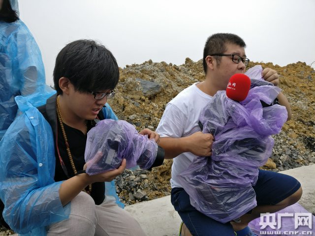 雨中采訪,記者們?yōu)榱吮Wo(hù)器材,紛紛為“武器裝備”穿上防護(hù)衣。