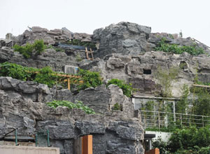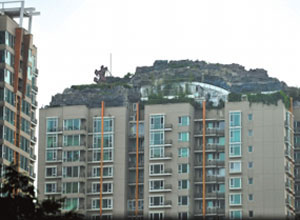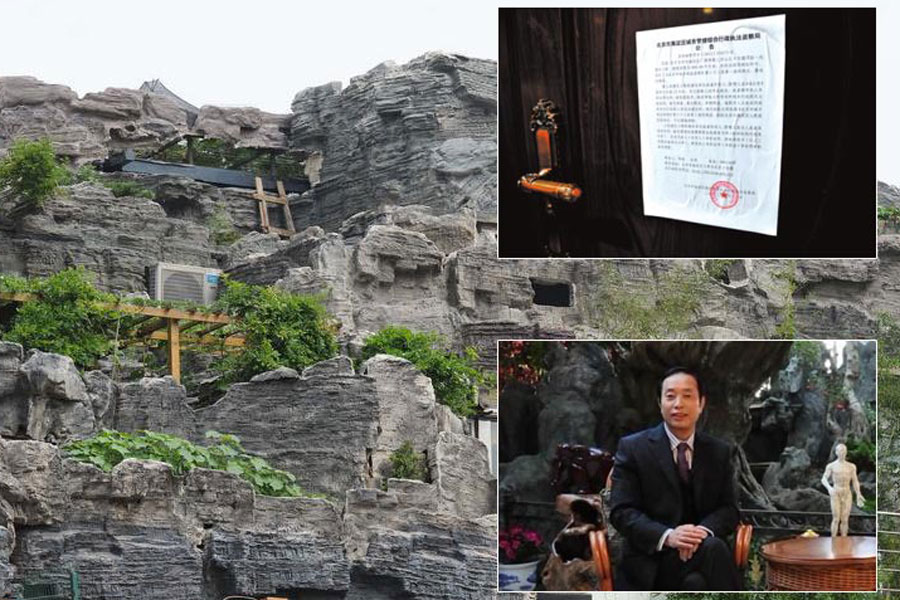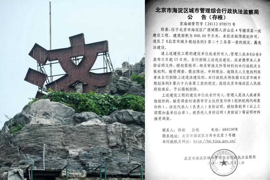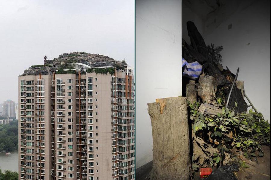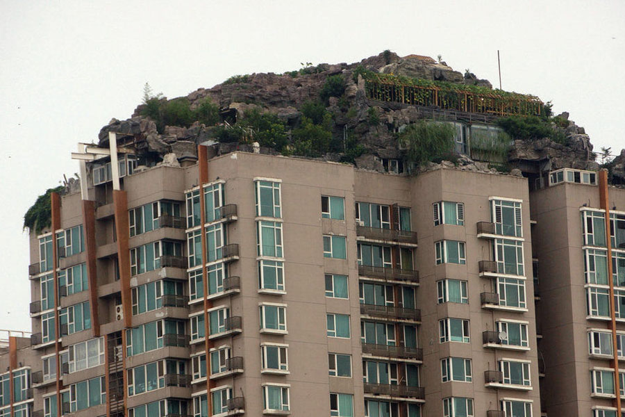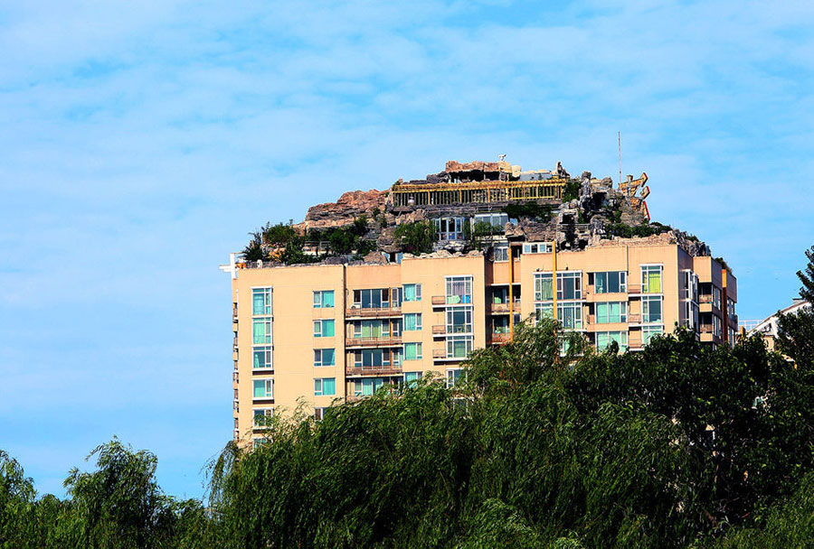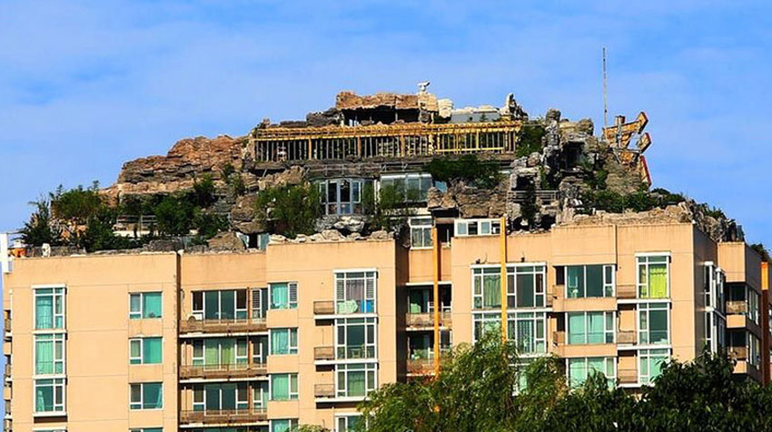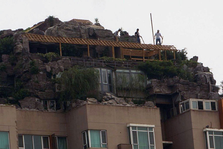 2001年,人濟山莊建成時,B棟的頂層平臺上,只有一座100多平米的2層小樓。2007年,這棟樓的頂層開始大興土木,6年過去,B棟頂層不但有“假山”別墅,上面還大樹成陰,怪石嶙峋。但實際上,這800平米的“空中假山”可以稱作為“北京最牛違建”。