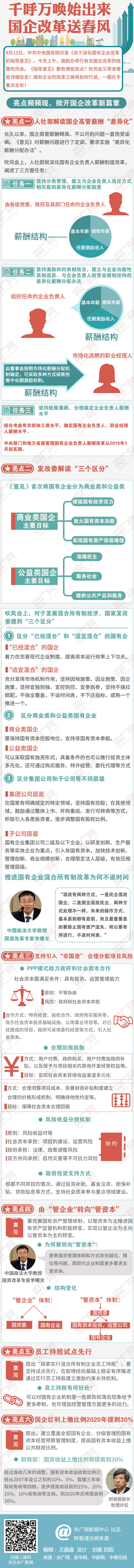 9月13日,中共中央國務院印發(fā)《關于深化國有企業(yè)改革的指導意見》。今天上午,國務院新聞辦公室舉行有關國企改革的政策吹風會!吨笇б庖姟范加心男┝咙c?吹風會又帶來哪些詳細信息?國有企業(yè)的改革之路將如何行進。一圖在手,重點全有!
