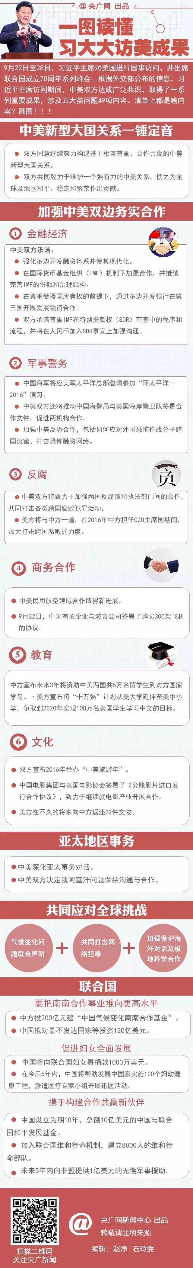 9月22日至28日,習(xí)近平主席對美國進行國事訪問,并出席聯(lián)合國成立70周年系列峰會。根據(jù)外交部公布的信息,訪問期間,中美雙方達成廣泛共識,取得了一系列重要成果,涉及五大類問題49項內(nèi)容。清單上都是啥內(nèi)容?戳圖!。