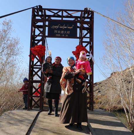 說話的這位叫阿米娜,是一位50多歲的維吾爾族婦女。阿米娜說,她就是從那時起,萌生了修橋的念頭。為了實現(xiàn)這個愿望,阿米娜一邊擺地攤、賣針頭線腦,撫養(yǎng)盲人丈夫和4個孩子,一邊省吃儉用,楞是用15年時間,攢下了10萬元積蓄。2008年阿米娜修建的60米長鋼架鐵橋橫跨河流兩岸。
