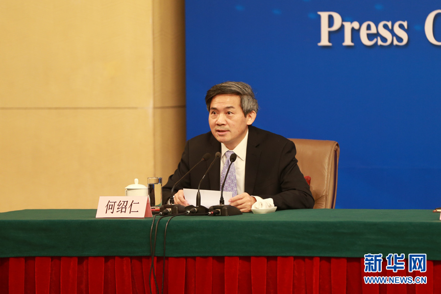 3月6日,十二屆全國人大五次會(huì)議舉行記者會(huì),邀請(qǐng)國家發(fā)展和改革委員會(huì)主任何立峰、副主任張勇、副主任寧吉喆就“經(jīng)濟(jì)社會(huì)發(fā)展與宏觀調(diào)控”的相關(guān)問題回答中外記者的提問。圖為記者會(huì)主持人何紹仁。新華網(wǎng)/中國政府網(wǎng) 傅義洲 攝