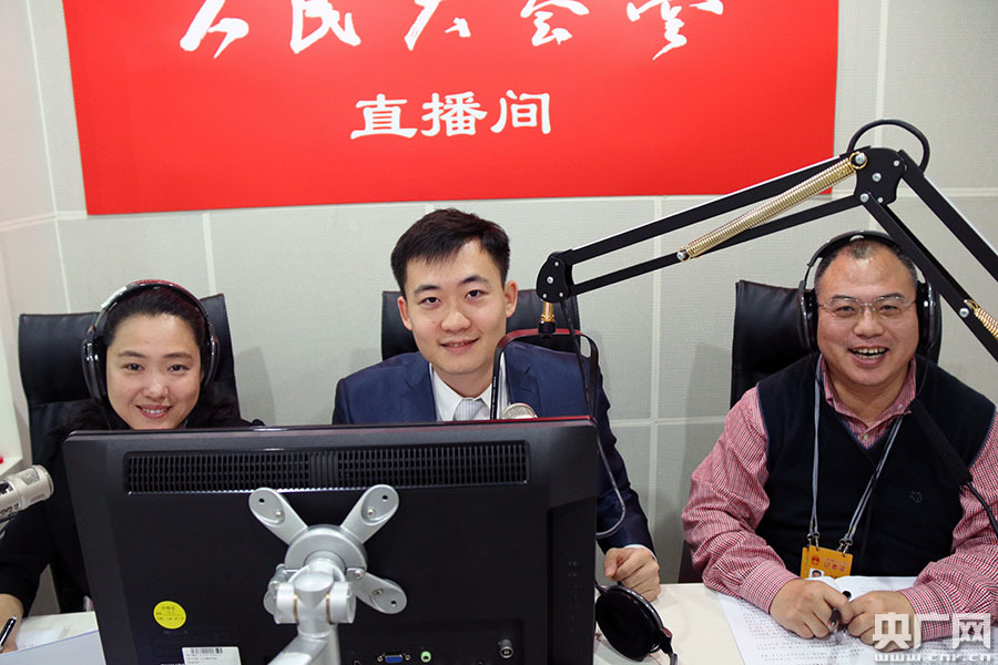 第十二屆全國人民代表大會(huì)第五次會(huì)議3月5日上午在人民大會(huì)堂舉行開幕會(huì)。圖為中央人民廣播電臺(tái)現(xiàn)場直播,主持人龐瑩(左)、鶴佳(中)、評(píng)論員白中華(右)。央廣網(wǎng)記者 吳海波攝