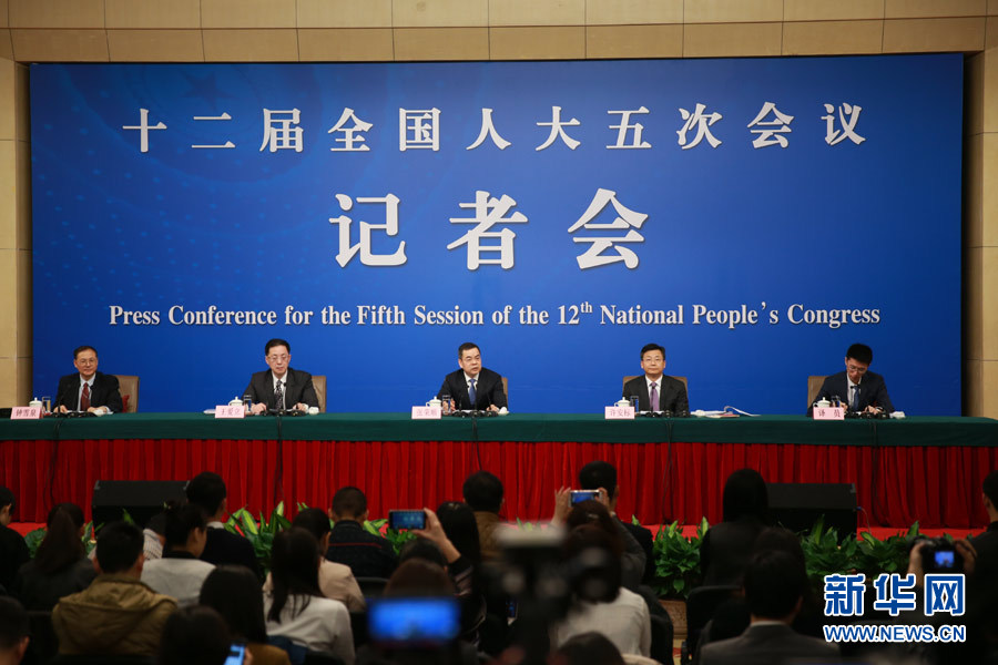 3月9日,十二屆全國人大五次會議新聞中心舉行記者會,邀請全國人大常委會法工委副主任張榮順、副主任許安標,刑法室主任王愛立就“民法總則草案與人大立法工作”的相關(guān)問題回答中外記者的提問。圖為記者會現(xiàn)場。新華網(wǎng)/中國政府網(wǎng) 傅義洲 攝
