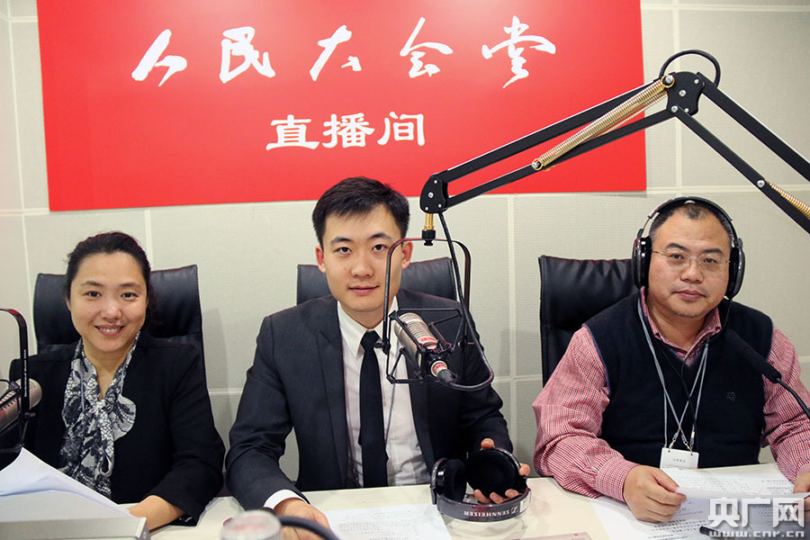3月8日15時,第十二屆全國人民代表大會第五次會議在人民大會堂舉行第二次全體會議,中央人民廣播電臺對本次大會進(jìn)行現(xiàn)場直播。圖為主持人龐瑩(左)、主持人鶴佳(中)、評論員白中華(右)。央廣網(wǎng)記者 吳海波攝