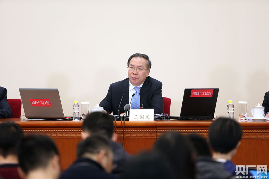 3月2日,全國政協(xié)十二屆五次會議新聞發(fā)布會在北京人民大會堂舉行,大會新聞發(fā)言人王國慶介紹會議有關(guān)情況并回答中外記者提問。圖為王國慶在發(fā)布會上回答記者提問。央廣網(wǎng)記者韓靖攝