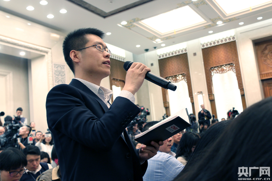 3月4日,十二屆全國(guó)人大五次會(huì)議在北京人民大會(huì)堂舉行新聞發(fā)布會(huì)。大會(huì)發(fā)言人傅瑩就大會(huì)議程和人大工作相關(guān)的問(wèn)題回答中外記者的提問(wèn)。圖為中央人民廣播電臺(tái)、央廣網(wǎng)、央廣新聞客戶(hù)端記者劉會(huì)民現(xiàn)場(chǎng)提問(wèn)。央廣網(wǎng)記者 吳海波攝