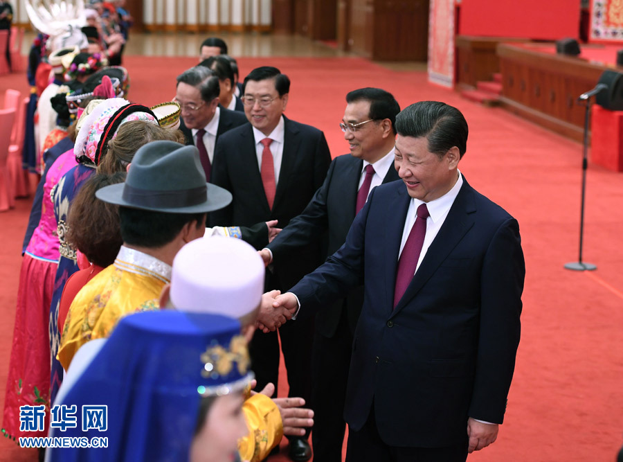 3月11日晚,中共中央統(tǒng)戰(zhàn)部、全國人大民族委員會、國家民族事務委員會、全國政協(xié)民族和宗教委員會在北京人民大會堂舉行茶話會,黨和國家領(lǐng)導人習近平、李克強、張德江、俞正聲、劉云山、王岐山、張高麗等與出席十二屆全國人大五次會議和全國政協(xié)十二屆五次會議的少數(shù)民族代表委員們歡聚一堂,共慶全國兩會勝利召開,共祝偉大祖國繁榮昌盛,共話中華民族美好未來。新華社記者 李學仁 攝