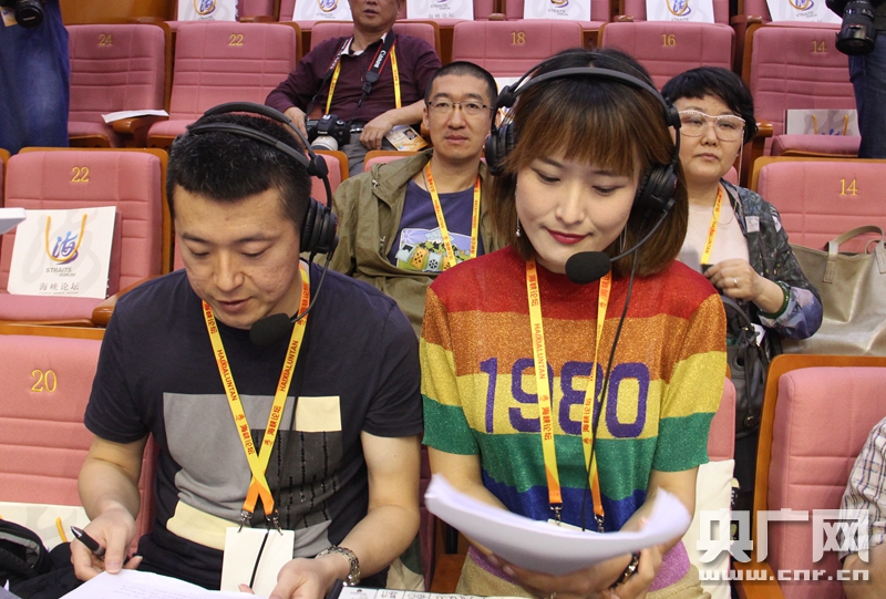 第九屆海峽論壇--論壇大會即將開幕,中央人民廣播電臺第五套節(jié)目中華之聲將對大會情況進(jìn)行現(xiàn)場直播。主播趙飛、曲飛正在進(jìn)行準(zhǔn)備。