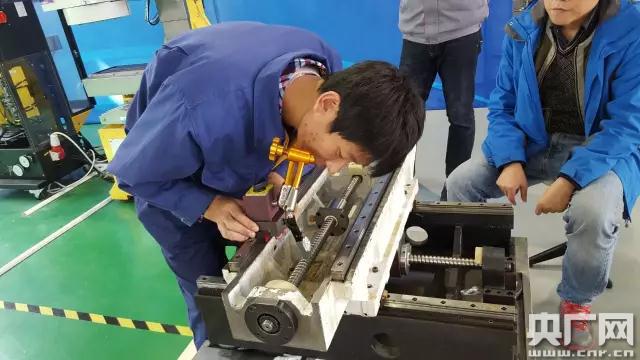 剛參加工作的半年時(shí)間里,黃實(shí)現(xiàn)所在的維修部,共接到過4800多個(gè)故障報(bào)告。身高1米8的他,450多次爬上三層樓高、不足半米寬的行床,在“獨(dú)木橋”般的平臺(tái)上操作,在機(jī)床淤泥里摸爬滾打的時(shí)候更是不計(jì)其數(shù),但遇到的問題永遠(yuǎn)不盡相同!霸趯W(xué)校的時(shí)我主要學(xué)機(jī)電,對數(shù)控機(jī)床‘零基礎(chǔ)’。好多數(shù)控機(jī)床都是進(jìn)口的,沒幾個(gè)人懂,(我)大約有半年帶著面包、饅頭,泡在車間里,沒老師,沒教材,有一些非常厚的說明書。對著設(shè)備捋線,調(diào)試各種各樣的參數(shù)。把這些代碼和參數(shù)都抄在小紙條上,隨時(shí)拿出來背,上千個(gè)技術(shù)參數(shù)刻在了腦子里,真是鉆進(jìn)去了。半年后發(fā)現(xiàn)我這個(gè)車間報(bào)修率越來越少。”