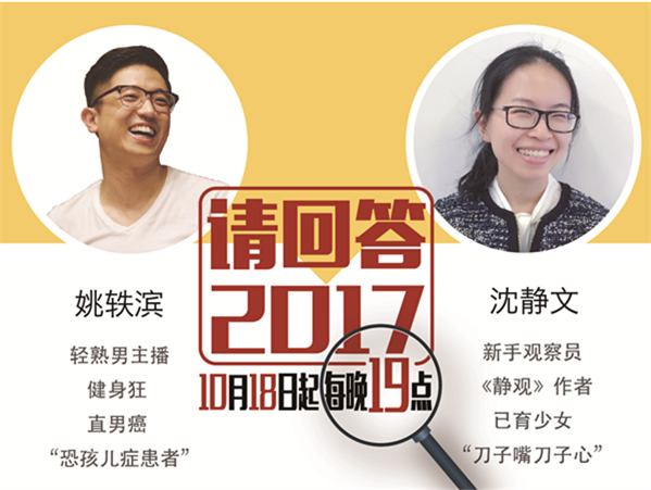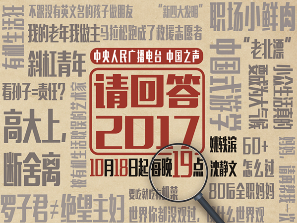 10月18日19:00—20:30,中國(guó)之聲十九大特別節(jié)目《請(qǐng)回答2017》推出第一期《不一樣的煙火:來(lái)一場(chǎng)和90后別開(kāi)生面的對(duì)話》。90后互聯(lián)網(wǎng)創(chuàng)業(yè)者、“摩羯座工作狂”Debbie;90后創(chuàng)業(yè)青年、“執(zhí)念管理者”霄鵬;90后類公務(wù)員、“在體制內(nèi)創(chuàng)業(yè)”力力;90后斜杠青年、話劇團(tuán)指導(dǎo)老師琳琳;帶領(lǐng)一大幫90后共事、60、70跨界資深職場(chǎng)人代表鄧?yán)賹⒆隹椭辈ラg!