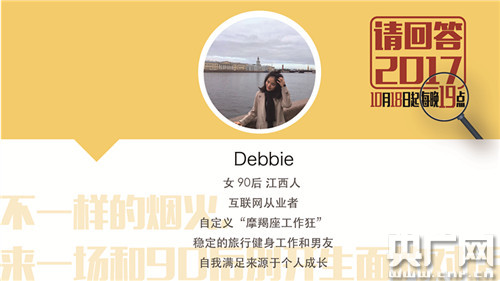 Debbie,女,90后,江西人;ヂ(lián)網(wǎng)從業(yè)者,自定義“摩羯座工作狂”,穩(wěn)定的旅行、健身、工作和男友,自我滿足來(lái)源于個(gè)人成長(zhǎng)。