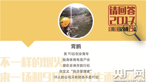 霄鵬,男,90后創(chuàng)業(yè)青年,投身體育電競(jìng)產(chǎn)業(yè)。曾在非洲開(kāi)旅行社,自定義“執(zhí)念管理者”,28人的公司只有財(cái)務(wù)不是90后。