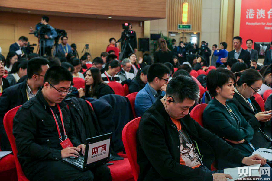 10月19日上午10:00,十九大新聞中心將在梅地亞中心二層新聞發(fā)布廳舉辦第一場(chǎng)記者招待會(huì)。將邀請(qǐng)中共中央紀(jì)律檢查委員會(huì)副書記、監(jiān)察部部長(zhǎng)、國(guó)家預(yù)防腐敗局局長(zhǎng)楊曉渡,中共中央組織部副部長(zhǎng)齊玉介紹加強(qiáng)黨建工作和全面從嚴(yán)治黨情況,并回答記者提問。 圖為記者招待會(huì)現(xiàn)場(chǎng)等待的媒體記者們。(央廣網(wǎng)記者 杜靜攝)