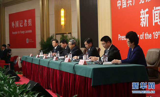 10月22日,十九大新聞中心舉辦記者招待會,邀請教育部、民政部、人力資源社會保障部、住房城鄉(xiāng)建設(shè)部、國家衛(wèi)生計生委相關(guān)負(fù)責(zé)人介紹滿足人民新期待,保障改善民生有關(guān)情況,并回答記者提問。圖為記者招待會現(xiàn)場。新華網(wǎng) 郝廣鵬攝
