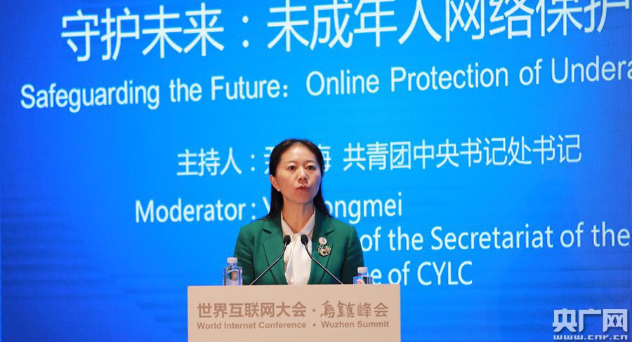 央廣網(wǎng)烏鎮(zhèn)12月4日消息(記者 王永康)今日上午九點,在烏鎮(zhèn)互聯(lián)網(wǎng)國際會展中心雨讀廳進行“守護未來:未成年人網(wǎng)絡(luò)保護論壇”。該論壇圍繞“未成年人網(wǎng)絡(luò)保護”,邀請中外政府官員、國際組織和青年組織代表、知名學者以及青少年代表進行研討。圖為共青團中央書記處書記尹冬梅致辭。