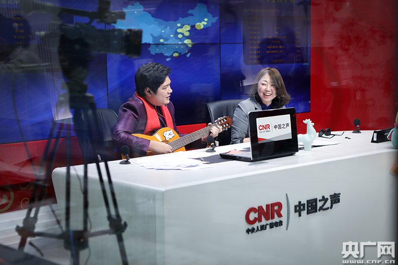 主持人大銘在直播間演奏吉他(央廣網記者 石昊鑫 攝)