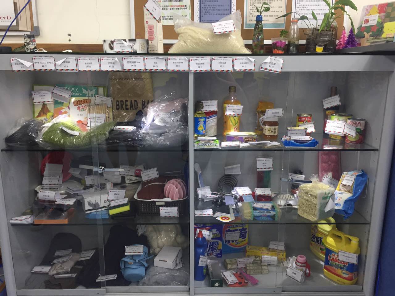 “社區(qū)互惠銀行”展柜里琳瑯滿目的兌換商品