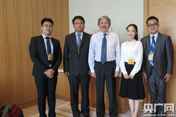 中央臺對港澳節(jié)目中心副主任胡翼(左二)、杜煒(右一)、宋雪(右二)、舒鵬(左一)與香港特區(qū)政府時任財政司司長曾俊華(中)合影。