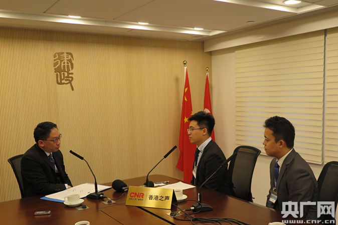 中央臺對港澳節(jié)目中心記者杜煒(右)、胡楊(中)采訪香港特區(qū)政府律政司司長袁國強(左)。