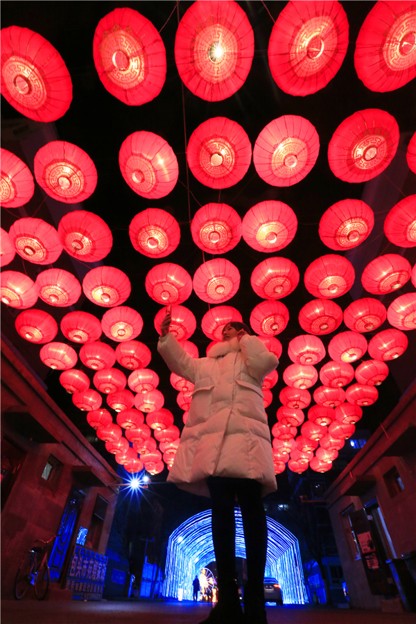 2月5日晚,包頭市昆區(qū)明日星城德景苑內(nèi)大紅燈籠高高掛,“時光隧道”般的燈飾將社區(qū)裝飾的格外漂亮,吸引了眾多居民拍照留念。(央廣網(wǎng)發(fā) 李強攝)