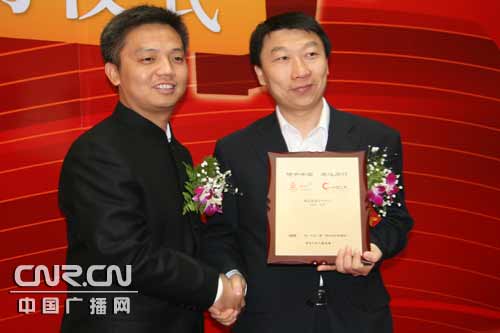 中央臺(tái)副臺(tái)長(zhǎng)王曉輝(左)向伊利集團(tuán)品牌管理部總經(jīng)理靳彪頒發(fā)“08奧運(yùn)報(bào)道合作伙伴”證書