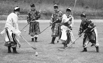 達(dá)斡爾族人對(duì)曲棍球運(yùn)動(dòng)情有獨(dú)鐘,有著深厚的群眾基礎(chǔ)。無(wú)論春夏秋冬,無(wú)論男女老少,只要有球,都能揮桿上陣,激戰(zhàn)一番。曲棍球也與達(dá)斡爾族人的生活密切相關(guān)。過(guò)去姑娘們出嫁時(shí)要帶上一根精美的球桿,以示對(duì)心上人的贊美和期望。達(dá)斡爾語(yǔ)把曲棍球運(yùn)動(dòng)稱作“貝闊他日克貝”,曲棍稱為“波依闊”或者“貝闊”,把曲棍球稱作“波列”!柏愰煛倍嘤酶繋澏鹊哪圩跄局瞥桑举|(zhì)堅(jiān)硬而富有彈性,便于擊打;“波列”則是用杏樹根塊或毛氈加工而成,有拳頭般大小。大人一般用木球,小孩一般用毛球。