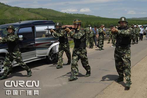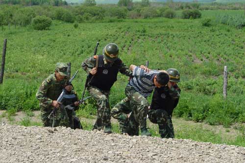 邊防官兵與解放軍官兵在阿爾山口岸監(jiān)管現(xiàn)場(chǎng)開(kāi)展軍警聯(lián)合反闖關(guān)演練