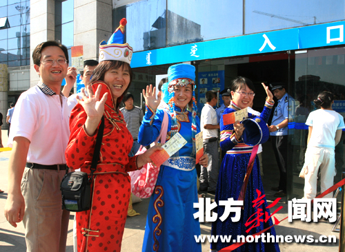 舉世矚目的北京奧運會就要開幕了。5日,在呼和浩特火車站進(jìn)站廳門前,幾名身著蒙古族服裝的年輕人手持奧運會比賽門票與親友道別。他們即將登上開往北京的列車,去觀看北京奧運會比賽,為奧運加油,為中國加油!(馬建荃)