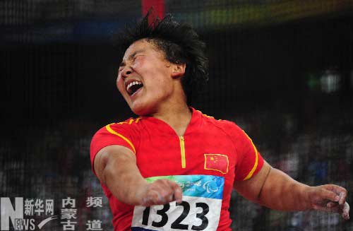 9月13日,中國選手孟根吉米素在比賽中。當(dāng)日,在國家體育場進(jìn)行的北京2008年殘奧會(huì)女子鐵餅F40級(jí)決賽中,孟根吉米素以28米04的成績奪冠,并打破世界紀(jì)錄。 新華社記者李尕?cái)z