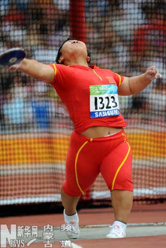 9月13日,中國(guó)選手孟根吉米素在比賽中。當(dāng)日,在國(guó)家體育場(chǎng)進(jìn)行的北京2008年殘奧會(huì)女子鐵餅F40級(jí)決賽中,孟根吉米素以28米04的成績(jī)奪冠,并打破世界紀(jì)錄。      新華社記者李尕?cái)z