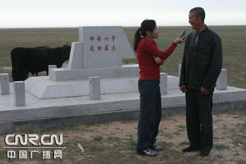 記者在神舟六號飛船主著陸場阿木古郎畜群點采訪邊民張存貴老人時,老人激動地說:“神舟六號飛船回收艙在我家草場著陸,這是中國人民的驕傲,也是我們?nèi)胰说尿湴;今年盼望著神舟七號也在這里著陸。為此,我已經(jīng)準(zhǔn)備好了五星紅旗和”歡迎回家“的標(biāo)語,和周圍群眾共慶和見證這一偉大的時刻的到來!