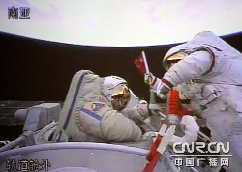 航天員翟志剛右手舉起小國旗。(中廣網(wǎng)記者南光 曹囡囡攝)
