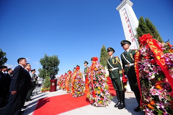 紀(jì)念活動(dòng)開始前,全體人員向大青山抗日根據(jù)地犧牲的烈士默哀,并向大青山抗日戰(zhàn)爭(zhēng)紀(jì)念碑敬獻(xiàn)花籃,致以崇高的敬意。