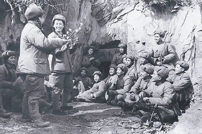 因為和敵人離得很近,一定不能大聲說話,等到晚上,排長就帶著我們,從壕溝前往戰(zhàn)士馬上要出擊的最前線。到了一個洞口,低著頭進去,進去以后黑乎乎的,我都看不清是點了一盞油燈,還是蠟燭,只看見地上坐著七八個人,其中有幾個人抱著槍。我們那時候慰問唱的最多的曲子叫《慰問志愿軍小唱》,戰(zhàn)士們想聽什么,我們就給他們唱什么,有求必應(yīng),因為第二天以后可能就見不著了……那些戰(zhàn)士第二天就要出擊,真刀真槍,每一個人眼神炯炯地看著我們,聽著我們唱,沒有任何畏懼,明天早上就要出征了,也許會沒命,但他們根本不考慮這個問題。有一個小戰(zhàn)士,看到我嗓子啞了,他就把他的水壺拿過來說:“啊,同志你喝一點兒”。那水也很金貴,所以我就抿了兩口,這是我印象最深刻的,我覺得他最多十六七歲,眼睛大大的,臉圓圓的,要是現(xiàn)在的話,可能還要摟著媽媽呢……