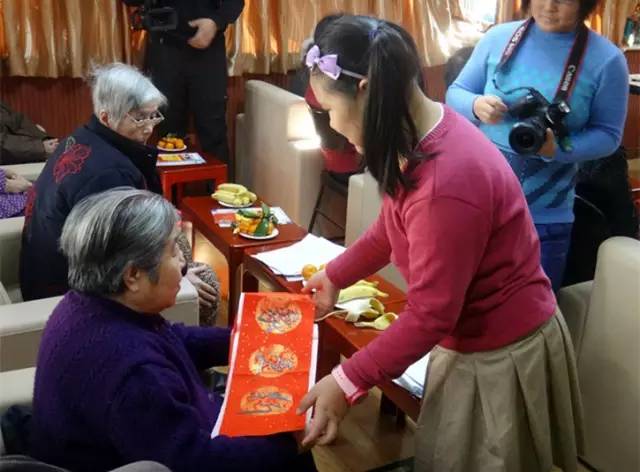禮物貼上了大大的“!弊郑笳髦篮玫淖T。一到春節(jié),不少人也都會(huì)請(qǐng)個(gè)“福”字貼在門(mén)上,老輩們更有這個(gè)講究,正所謂“全壽富貴之謂!。今天,志愿者們專(zhuān)門(mén)帶著筆墨紙硯,現(xiàn)場(chǎng)給老人寫(xiě)福字。
