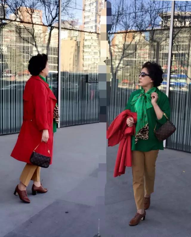 紅風(fēng)衣+綠色打底衫+亮綠色絲巾+米色褲子+深棕色鞋+咖色小包