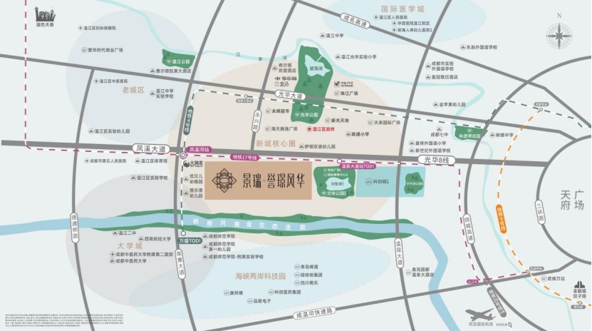 在選址上,景瑞精擇光華新城向南發(fā)展核芯板塊,北臨城市主軸鳳溪大道,是串聯(lián)城市發(fā)展格局“南城北林”的重要軸線,南毗楊柳河濱水生態(tài)帶,上承西成都醇熟生活圈,下接西成都全新CBD,以改善人居形態(tài),共同構(gòu)建“西成都金三角”版圖,成就西成都城市新中芯。