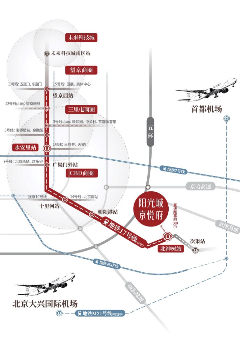 其中,在建的17號(hào)線作為北京第一條南北大通道干線,南段預(yù)計(jì)于2021年年底通車,這是一條貫穿“三城一區(qū)”的關(guān)鍵線路,北部直達(dá)未來(lái)科學(xué)城版塊,南部直達(dá)亦莊經(jīng)濟(jì)開(kāi)發(fā)區(qū),三城一區(qū)協(xié)同發(fā)展格局初步形成。值得注意的是,北京地鐵17號(hào)線亦莊新城范圍內(nèi)的亦莊站前區(qū)南站、次渠站、次渠北站、北神樹(shù)站將建成軌道微中心。而陽(yáng)光城京悅府距離17號(hào)線北神樹(shù)站直線距離約600米。