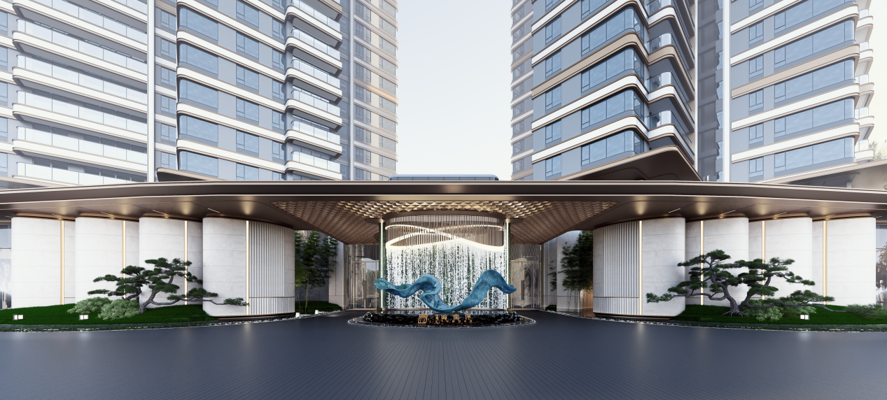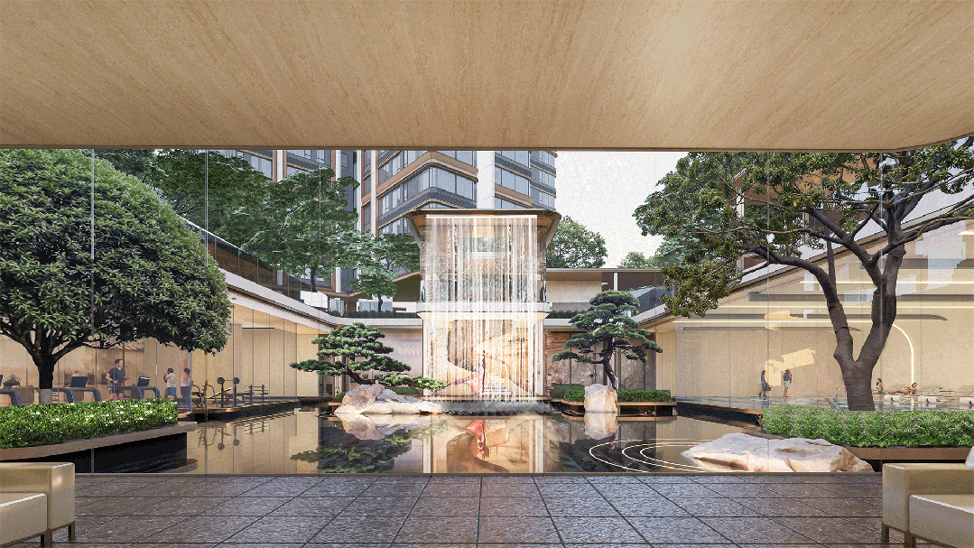 歸家之路,始于約88米的酒店式落客大堂,星空鏡面水景與“絲綢之路”主題雕塑靜靜相迎,兩側(cè)全冠移植的百萬級(jí)珍稀羅漢松,以其蒼勁姿態(tài),營(yíng)造出“靜奢歸心”的東方儀式感。這不僅僅是通道,更是情緒轉(zhuǎn)換的場(chǎng)域。