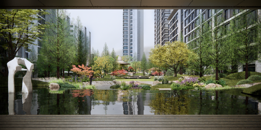 小區(qū)內(nèi)部打造“一軸12景”,通過(guò)一條景觀主軸貫穿東西區(qū)。東區(qū)以觀心亭為中心,串聯(lián)星趣童巖、星語(yǔ)林間;西區(qū)以星瀾湖為中心,串聯(lián)愛(ài)心無(wú)邊草坪、攬?jiān)聵颉2懦龉珗@,又入花園——這不是修辭,而是每天推開(kāi)窗的真實(shí)風(fēng)景。