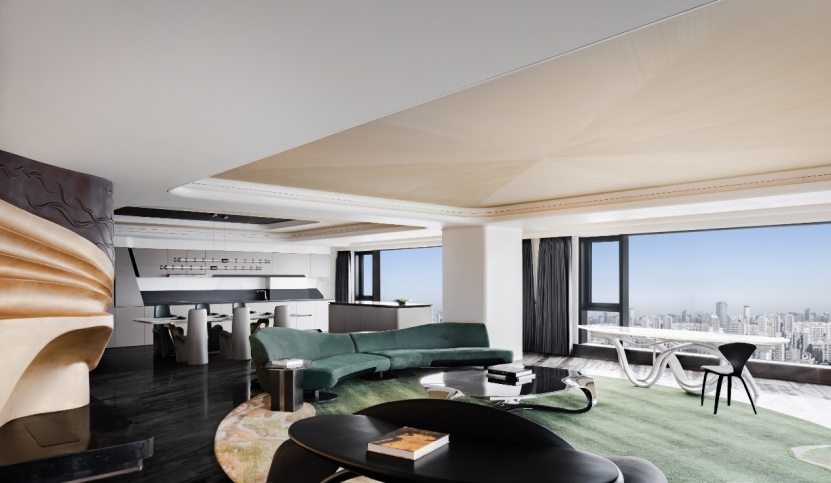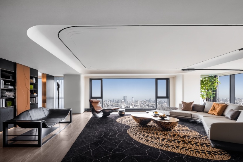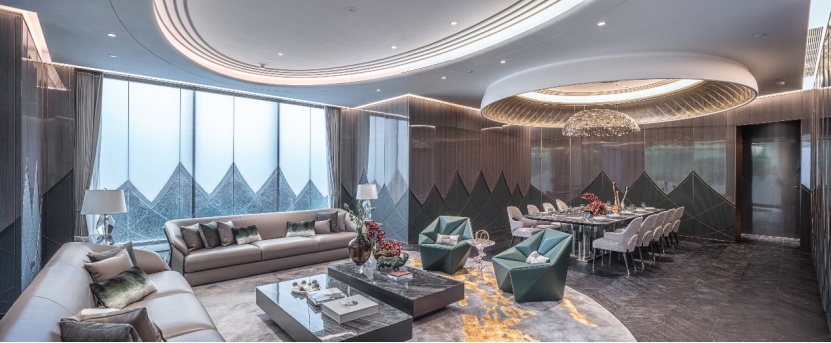 建筑面積約308平米二居室樣板間內(nèi),270°環(huán)幕全景落地玻璃幕墻,開闊視野,靈動(dòng)的流線與華美的弧線營造出廣闊的延伸感,給予居者無限的想象空間。