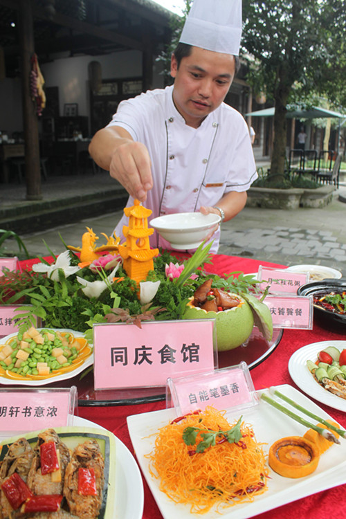 在安仁美食薈的展示區(qū),作為東道主的安仁老公館同慶食館推出了富于公館文化的系列菜品。其中“明軒書意濃”、“自能筆墨香”、“元琥誘惑”都是充分挖掘了安仁民國時期公館的餐飲文化的力作。制作這一系列公館菜肴的廚師,還別具匠心地雕刻了安仁的標志性建筑“仁者安仁塔”。龍門陣九大碗、黃雞肉、游血旺、名肴天下、彭雞肉、郭雞肉、火二哥飯店、晉昊私房菜等古鎮(zhèn)知名餐飲店也都各自展示了川西古鎮(zhèn)風味的菜肴。