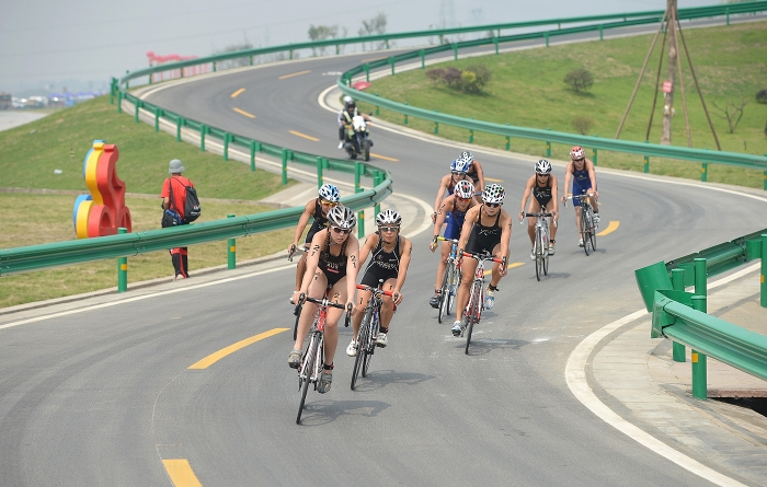 約30分鐘后,運(yùn)動(dòng)員從水里出來,跑步進(jìn)入比賽的轉(zhuǎn)換區(qū),快速換上頭盔、運(yùn)動(dòng)鞋等裝備,開始40公里的自行車賽程。完成這個(gè)階段的比賽需要繞游泳的人工湖騎行6圈!斑\(yùn)動(dòng)員在轉(zhuǎn)換區(qū)的用時(shí),計(jì)算入比賽總時(shí)間!爆F(xiàn)場(chǎng)技術(shù)官員解釋,在轉(zhuǎn)換區(qū),運(yùn)動(dòng)員只能推行自行車,到自行車賽道的上車處才能騎行,違規(guī)的選手將接受罰時(shí)處理。另外,轉(zhuǎn)換區(qū)還是運(yùn)動(dòng)員補(bǔ)充體力和水分的地方。